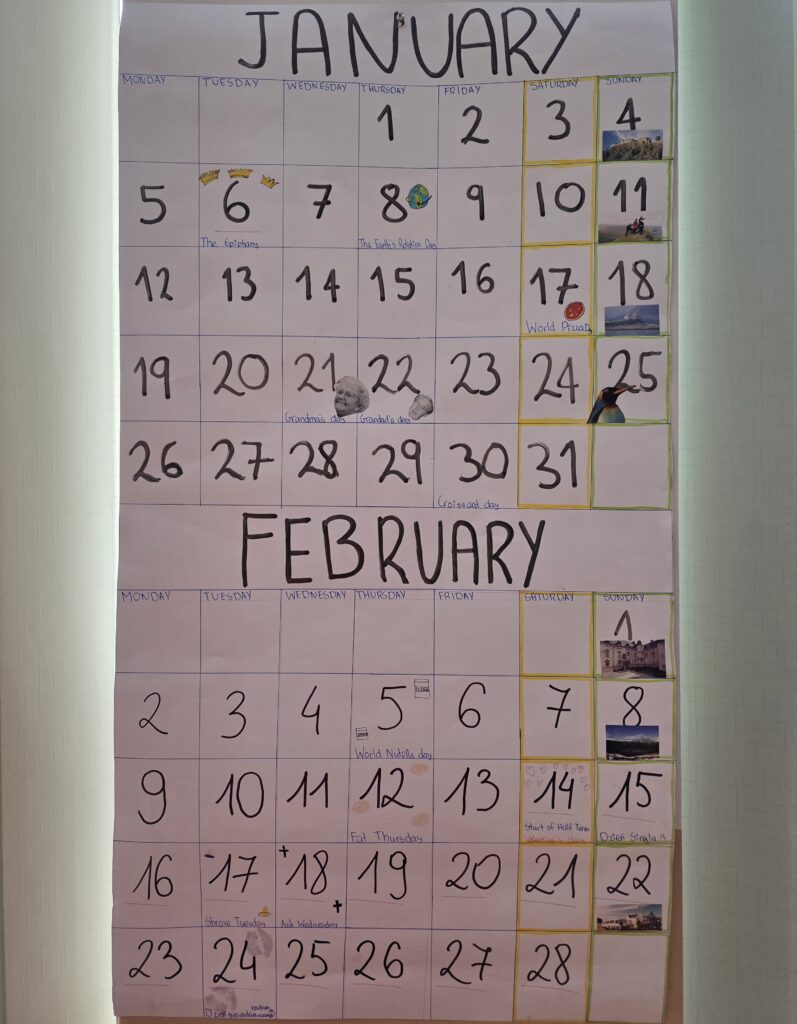 Class 3D contributed to improving the quality of all students’ work at the beginning of the year 2026. On the very first day after Christmas break they made a calendar for two months, namely January and February. This beautiful handmade calendar is now the one which helps to ge to know what, when and where:) Good job!